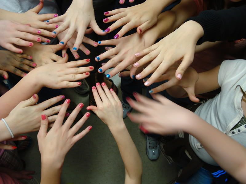 Sparkle had an awesome night last night!! We had "Mystery Night". First off, I'd like to give a huge shout out to Crystal, Lisa, Ashley and Ashley for helping me and Shannon last night. We could not have done that without all of you!!!! Back to Mystery Night...The suspense was killing the 23 girls to know where we were going. As we left the annex with the van and 3 cars of girls, they guessed everything from movies to eating to laser tag to an art gallery. They were stumped! Oh! The suspense! As we pulled in the parking lot, Lisa, Shannon and I (and the girls that came to the first official Sparkle slumber party last semester) had to laugh. That was our 'rendezvous point' that night! I'll save that for another post! First destination: "Happy Nails"! If you get the opportunity to go there, GO! They are AMAZING and quite fun too! They treated us like ROYALTY! (Girls - don't forget you are ROYALTY!) We got our nails and toenails painted. Macy, Cara and some others filled up my entire memory card in my camera with photos. I think I have a shot of every moment of the night!!! I think there are like 300+ pictures.